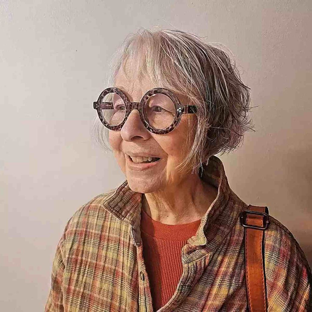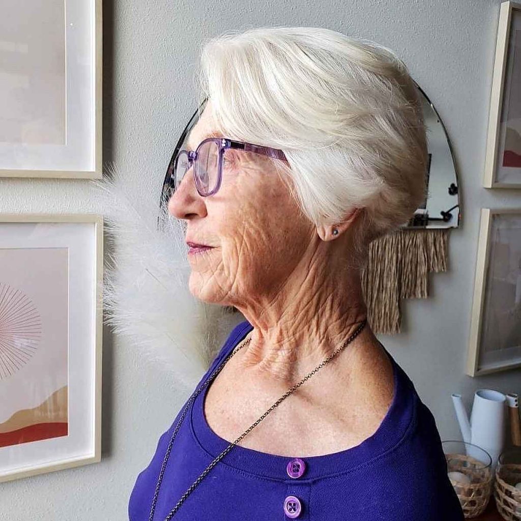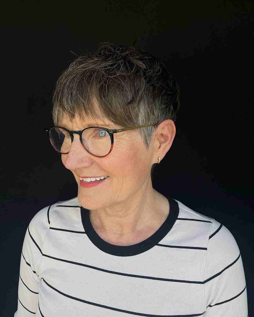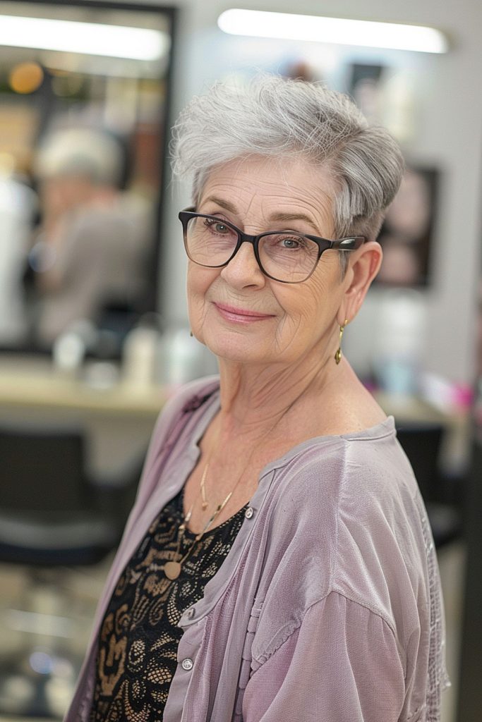 Short haircuts are timeless and remain a popular choice for women over 70. A classic pixie cut, for example, offers a chic and low-maintenance option that exudes confidence and style. This haircut beautifully frames the face and draws attention to the eyes and glasses, creating a sophisticated and youthful look.