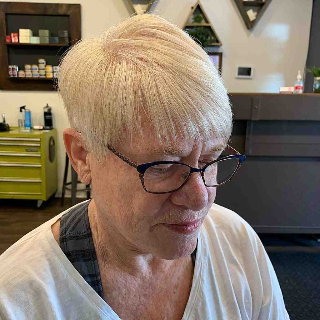 Bangs are another stylish option for women over 70 who wear glasses. Soft, side-swept bangs or a bold, blunt fringe can draw attention to the eyes and glasses, adding a trendy and youthful element to the hairstyle. Bangs can be adapted to suit different face shapes and hair types, making them a versatile choice.
